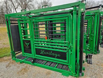 1 AVAILABLE, Hydraulic head restraint, head gate, parallel squeeze, tail gate; Removable sternum bar; Each side has two large branding doors with slam latches: Each side has top/bottom/full doors that open together or separately; Injection door on each side; Palpation gates squeeze WITH the chute sides to help prevent calves from turning; Power unit included; Powder coated North American steel; 13 HP gas or 220V electric power unit. 7 GPM hydraulic flow. Full rebar floor, Neck Extenders