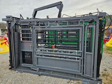 1 AVAILABLE, HYDRAULIC HEAD RESTRAINT, HEAD GATE, PARALLEL SQUEEZE, TAIL GATE: REMOVABLE STERNUM BAR; EACH SIDE HAS TWO LARGE BRANDING DOORS WITH SLAM LATCHES: EACH SIDE HAS TOP/BOTTOM/FULL DOORS THAT OPEN TOGETHER OR SEPARATELY; HINGED BRANDING DOORS ON EACH SIDE; INJECTION DOOR ON EACH SIDE; PALPATION GATES SQUEEZE WITH THE CHUTE SIDE TO HELP PREVENT CALVES FROM TURNING; GAS POWER UNIT; POWDER COATED NORTH AMERICAN STEEL; 7 GPM HYDRAULIC FLOW. FULL REBAR FLOOR, NECK EXTENDERS, FILL WITH AROUN